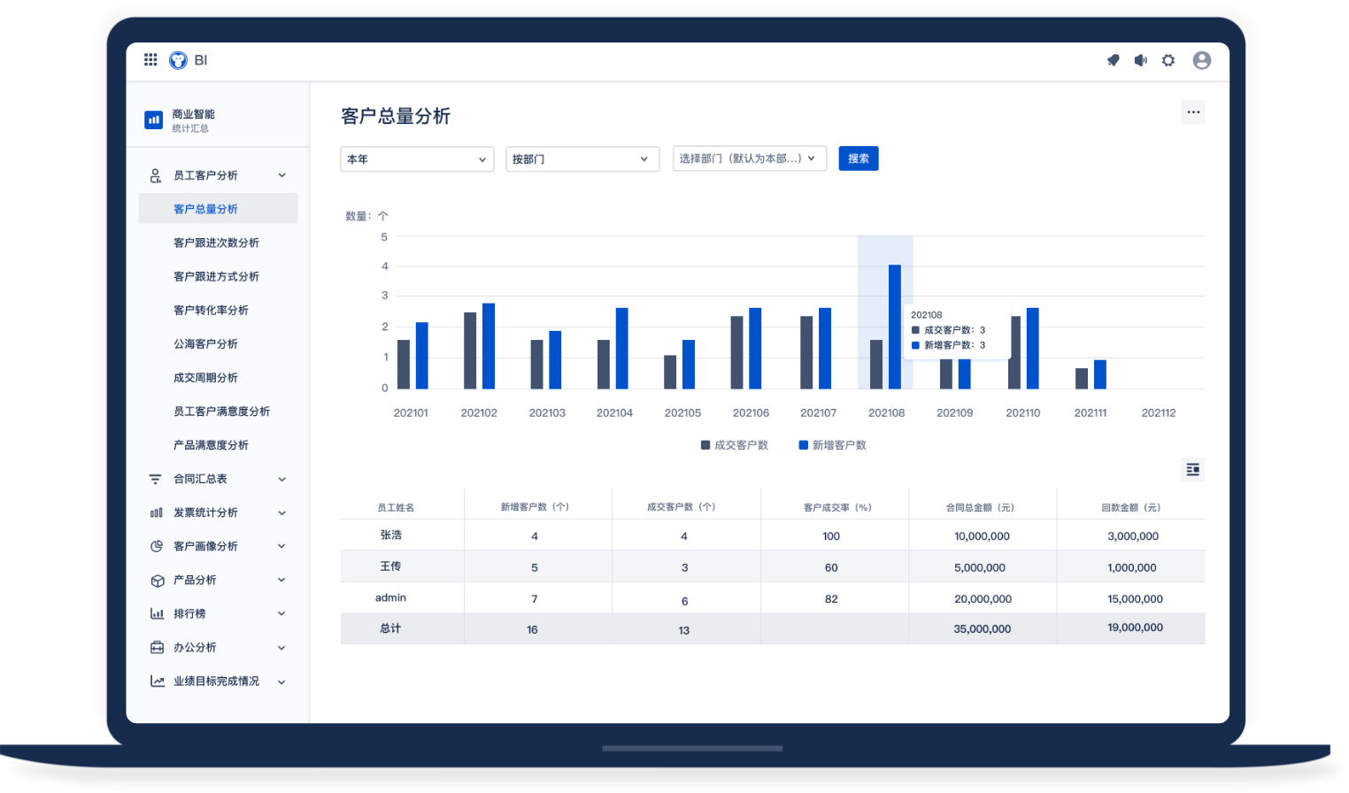 豐富的報表類型關聯了多樣的數據主體:客戶、線索、商機、合同、地域分布、跟進次數等等可實時查看,全面把握客戶動態,激發員工能動性。
